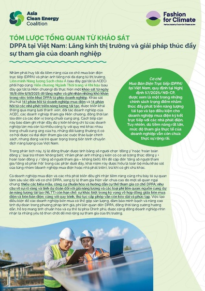 Viet Nam’s Direct Power Purchase Agreement (DPPA), legalised under Decree 57/2025/ND-CP, has been positioned as a cornerstone policy to accelerate renewable energy deployment and enable corporates to contract directly with generators. Yet, despite its strong potential, industry uptake has so far remained modest. To better understand why and to capture perspectives directly from market participants, the Asia Clean Energy Coalition (ACEC) and the Fashion Industry Charter for Climate Action (Fashion Charter) conducted a survey from 18 August to 6 September 2025. The survey gathered 141 responses from corporate buyers and 14 from renewable energy developers, distributed through ACEC membership, Fashion Charter signatories, ACEC’s broader networks, and cascaded further to supply chain partners. This approach ensured insights not only from large electricity users but also from firms of various sizes in their supply chains that are often underrepresented in policy discussions yet play a critical role in Viet Nam’s energy transition.